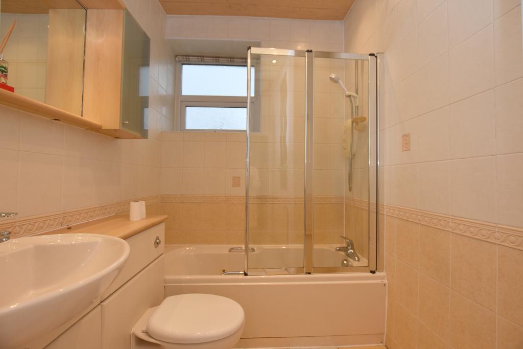 BATHROOM: Housing 3-piece suite comprising concealed w.c., vanity washbasin with mirrored cupboard unit over, panelled bath with electric shower over, airing cupboard housing central heating boiler.