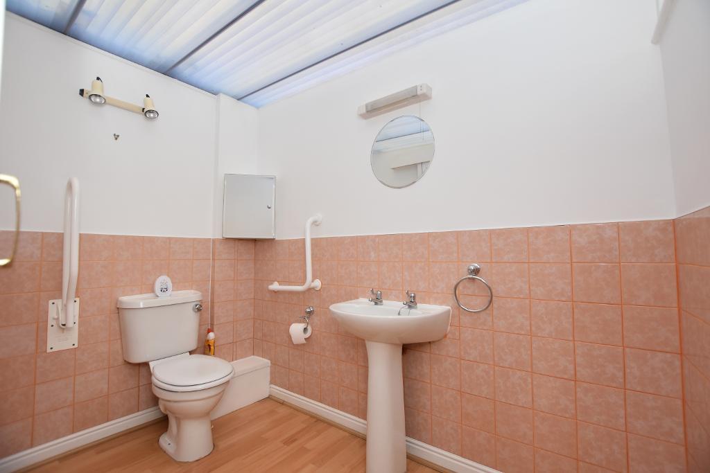 CLOAKROOM: two piece suite comprising wc, pedestal handwash basin, hand rails, vanity cupboard.