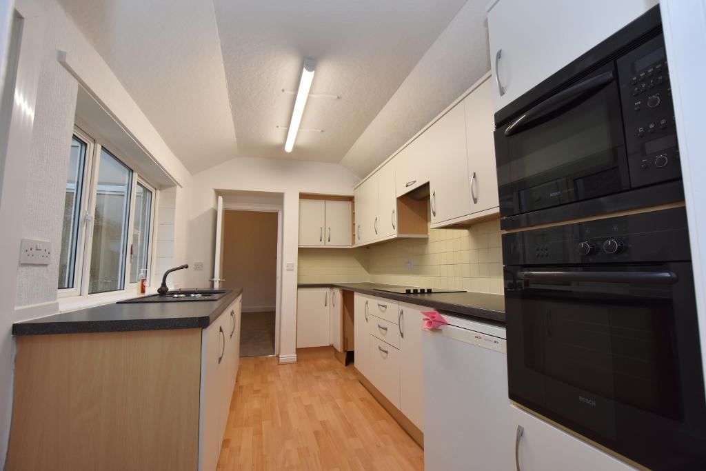 KITCHEN: 2.3m x 4m (7"5" x 13"1"); with a range of fitted wall and base units with complementary laminate working surfaces, dishwasher, washing machine, low level fridge, integrated oven, integrated microwave, 4-ring induction hob and extractor over, one and a half bowl sink & draining unit, external door to rear yard.
