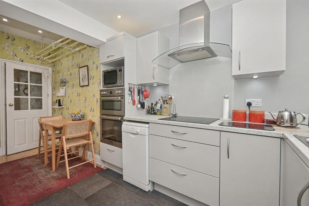 Extended Dining/Kitchen: 2.6m x 2.8m (8"8" x 9"2") by 2.2m x 2.0m (7"3" x 6"8"); with half wood, half tiled floors, a range of modern fitted base and matching wall storage cupboards with complimentary working surfaces. Built-in electric oven and grill, four-ring electric hob with extractor over, single drainer stainless steel sink unit. Plumbed and drained for an automatic washing machine and dishwasher, space for fridge freezer, low voltage lighting, UPVC external door to the rear of the property.