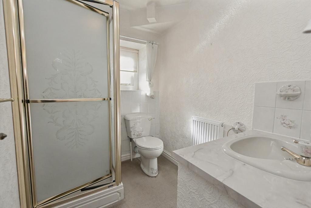 with a 3-piece suite comprising low suite W.C, vanity wash handbasin with storage under and tiled splashback, corner shower enclosure with fitted Mira thermostatic shower and part tiled walls.