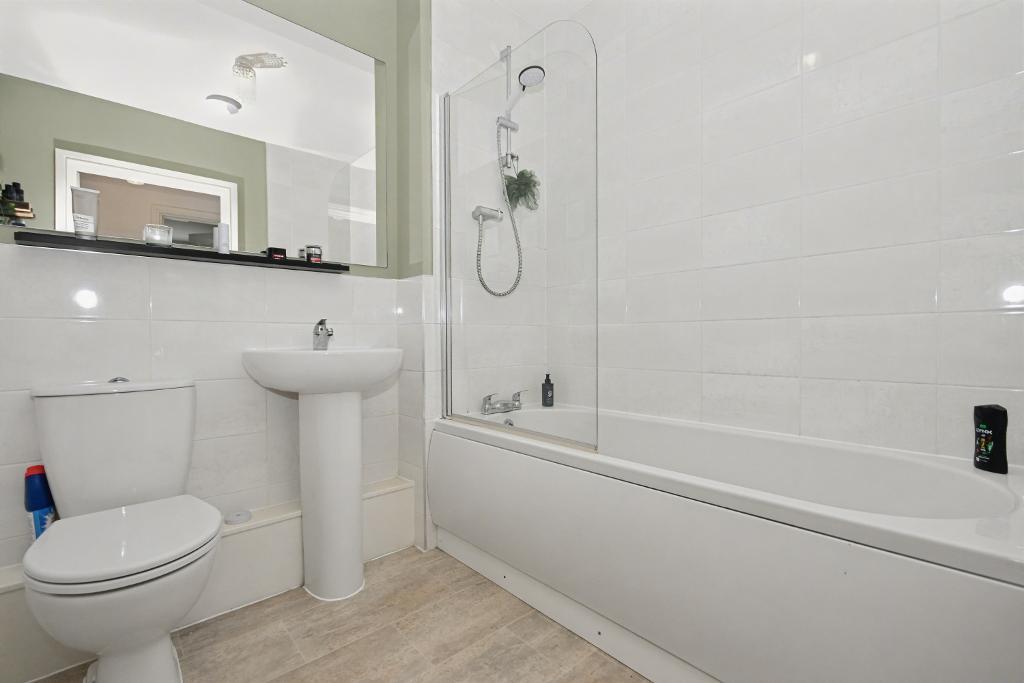 BATHROOM: with a 3-piece suite in white comprising a low level W.C, pedestal handwash basin and a panelled bath with a plumbed shower over, partially tiled walls, extractor fan.