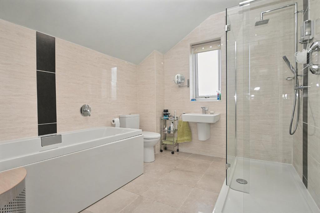 Ensuite Bathroom: 2.9m x 2.6m (9'5" x 8'6"); with a four-piece suite in white comprising a low level W.C, wash handbasin, panelled bath and walk-in shower enclosure with plumbed shower with overhead shower and shower mixer, heated stainless steel towel rail, fully tiled walls, tiled floor, low voltage lighting, extractor fan.