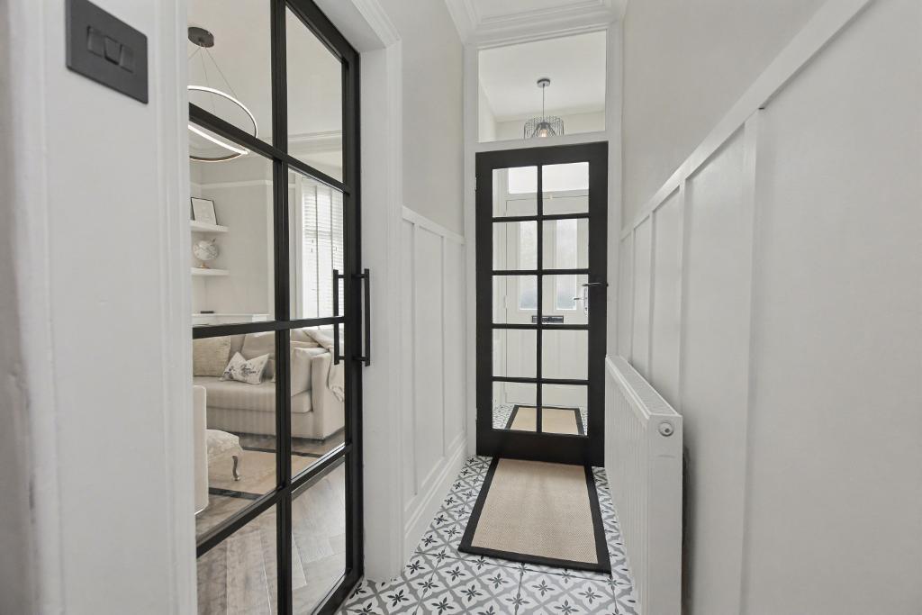 Entrance: through half-glazed composite Rockdoor into entrance vestibule with coat hooks, modern period-style tiled floor and glazed door to hallway.