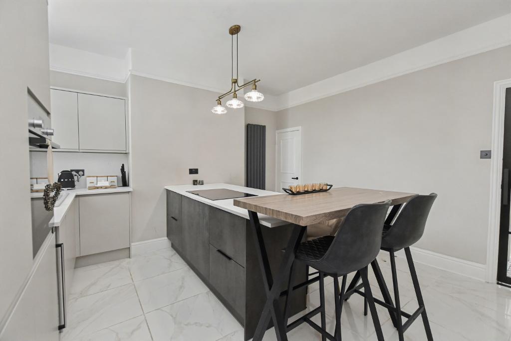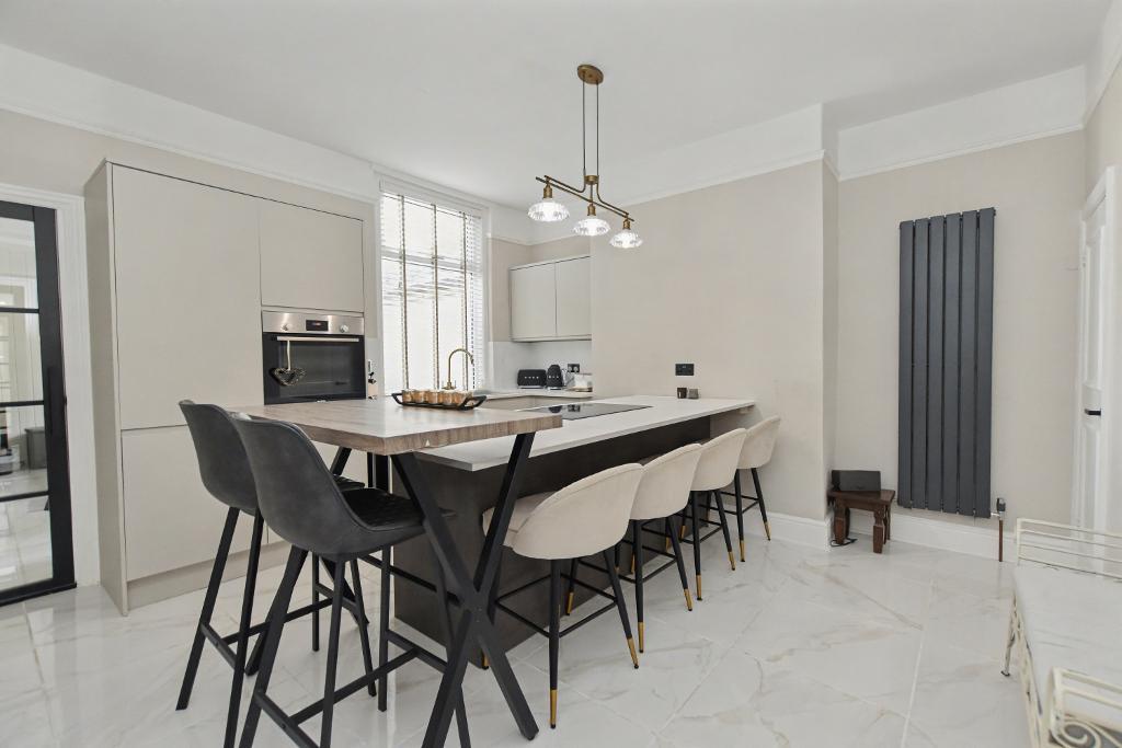 Kitchen Diner: 4.3m x 4.1m (14"1" x 13"4"); with a modern range of two-tone wall and base units with complimentary white laminate work surface, one bowl single drainer sink unit with mixer tap with filtered water. Integrated Bosch electric fan oven, five ring ceramic hob, wine chiller, central island unit with breakfast bar for four stools, integrated fridge freezer, tall modern contemporary central heating radiator, tiled floor, picture rail and good size understairs storage cupboard with electric light.