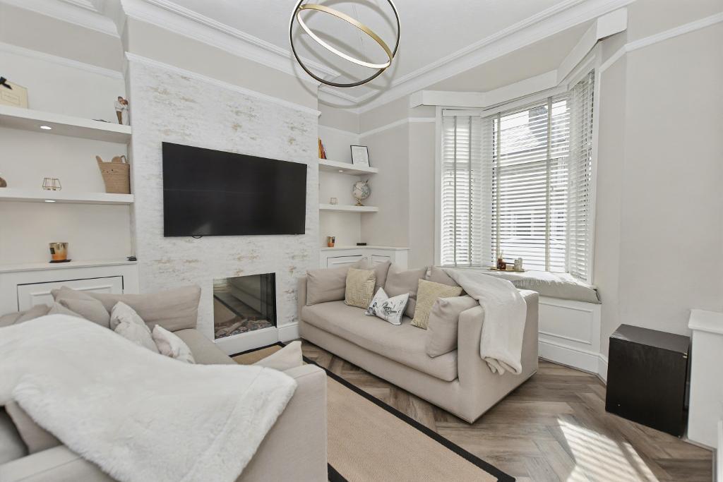 Lounge: 3.4m x 4.1m (11"1" x 13"6"); with a bay window to the front with window seat and fitted blinds, feature cornicing and picture rail, built-in shelving and storage cupboards in either alcove with feature lighting, television point. Inset electric fireplace and wood-effect herringbone LVT flooring.