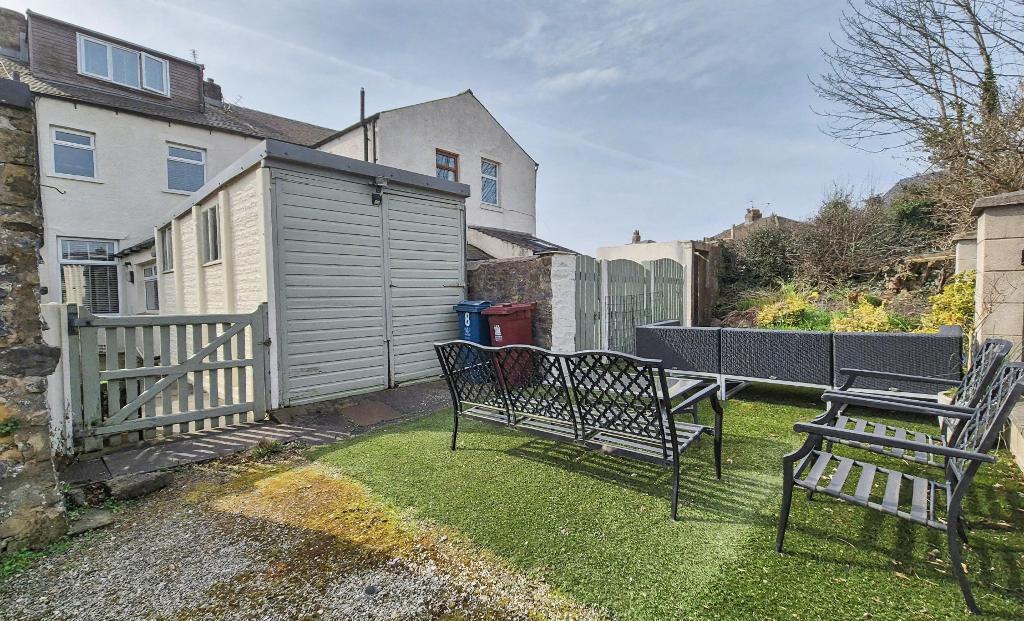 To the front of the property is a forecourt front garden with slate chippings and paved pathway to front door. To the rear there is a paved enclosed yard, single garage with wooden opening doors. The property also owns the land across the rear access street; this offers a further seating area with artificial lawn.