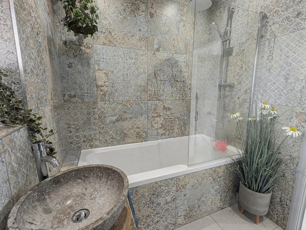 Bathroom: 2.0m x 1.8m (6'6" x 5'11"); with a 3-piece contemporary suite with a low level W.C, stone effect vanity sink and a panelled bath with plumbed shower over and vanity screen. Built-in storage cupboards housing combination central heating boiler, tiled flooring, fully tiled walls, low voltage lighting, extractor fan, heated stainless steel towel rail.