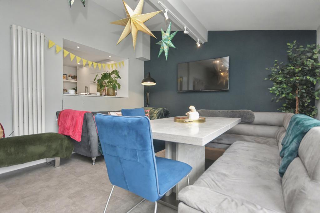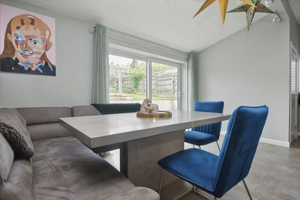 Dining Room: 5.0m x 3.8m (16'5" x 12'6"); extended dining area with television point and sliding patio doors to the rear garden, feature vertical central heating radiator.