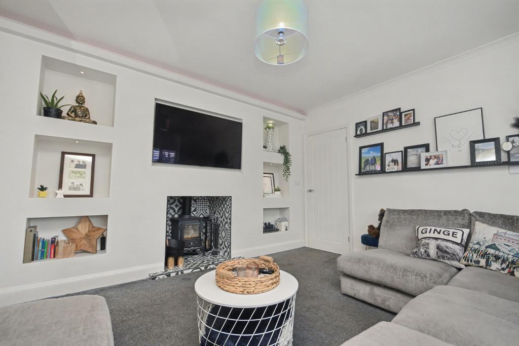 Lounge: 3.9m x 3.6m (12'11" x 11'9"); with media wall and a multifuel burner in feature surround. UPVC window with shutters.